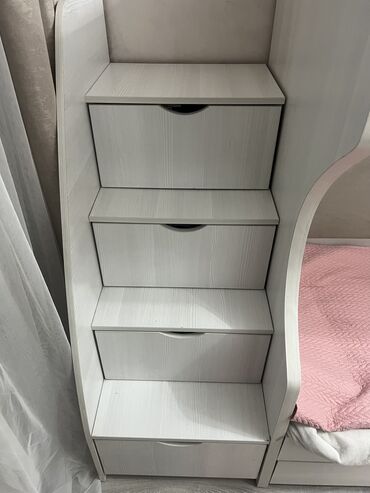 Двухъярусная кровать белого цвета с вертикальной лестницей и ящиками