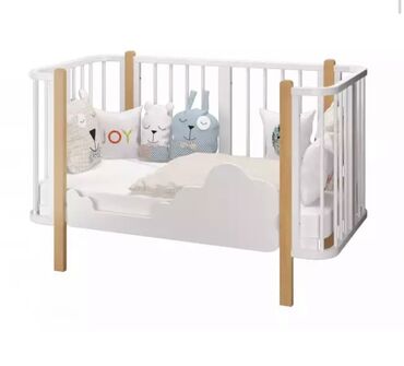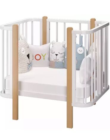 Детская кроватка с белыми решетчатыми бортиками и светлыми деревянными