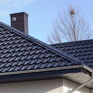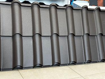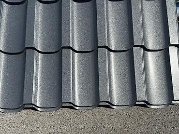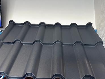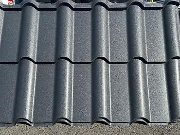 Металлочерепица темно-серого цвета. Имеет профиль, имитирующий натуральную черепицу, что придает кровле эстетичный вид. Подходит для использования в различных климатических условиях.