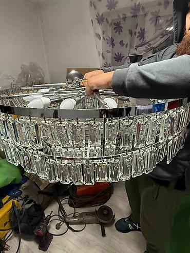 - Декор: несколько ярусов вытянутых хрустальных/стеклянных подвесок-призм, создают мощное свето-преломление и «рисунок» на стенах.