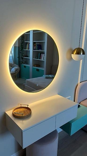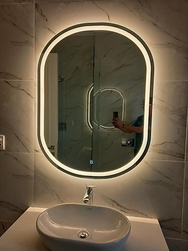- Свет: нейтрально‑тёплый/нейтральный белый (видны оба варианта на фото). Сенсорная кнопка на поверхности зеркала для включения.
