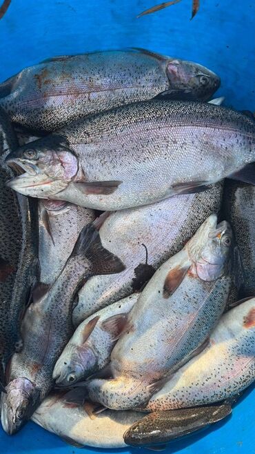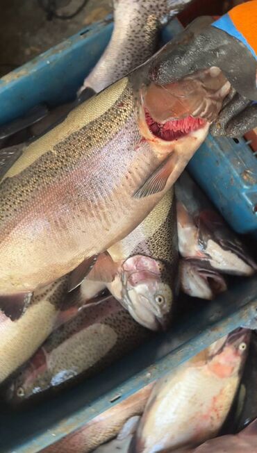 Свежая Форель одна рыба весит 1кг до 1.5 кг адрес город токмок оптом цена 550 сом Описание: - Цельные тушки с головой, чешуя серебристая, розовое мясо. - Свежая разделка: удалены внутренност...