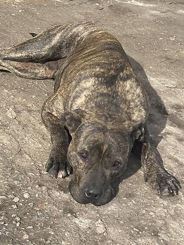 Собака крупного размера с тигровым (бринделевым) окрасом. Короткая гладкая шерсть с выраженным полосатым рисунком, мощное мускулистое телосложение, широкая грудь и крепкие лапы. Голова массивная, с короткой мордой, тёмными глазами и чёрной мочекой носа. Уши естественной формы. На груди — белое пятно.