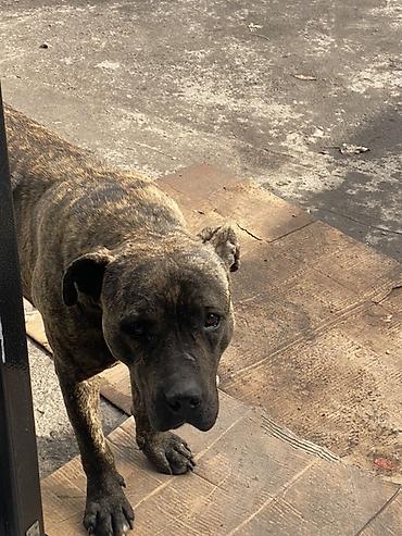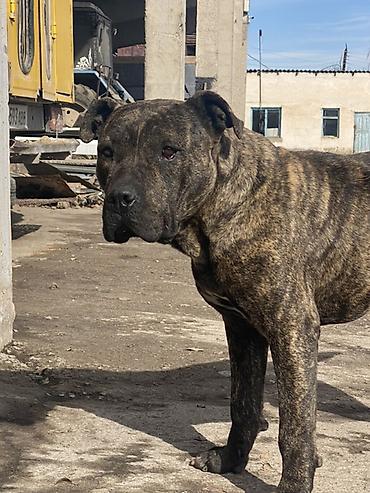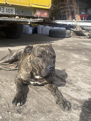 Собака крупного размера с тигровым (бринделевым) окрасом. Короткая