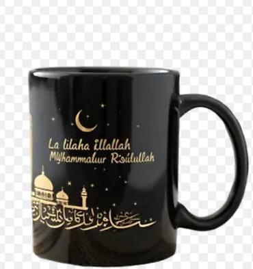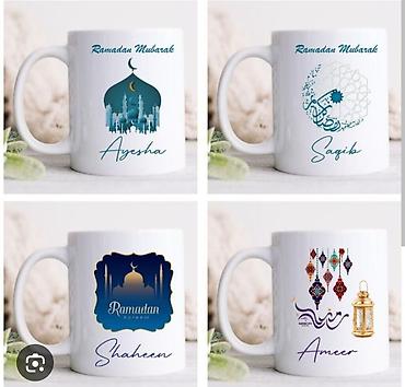 - Белые и чёрные керамические кружки с тематическими принтами: арабская каллиграфия, мечеть, полумесяц, «Ramadan Mubarak», «Ramadan Kareem» и др.
