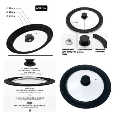 Универсальная стеклянная крышка 3 в 1, подходящая для диаметров 24, 26 и 28 см. Цена 650 сом