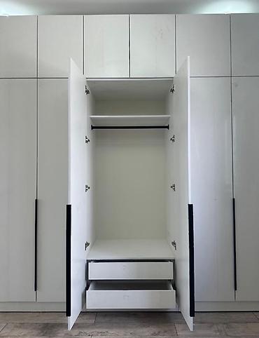 - Витрина: высокая застеклённая секция с внутренними полками для посуды/декора.