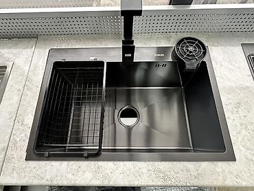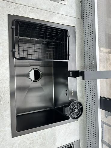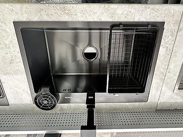 Многофункциональная кухонная раковина графитого модного цвета одним большим секциям, оснащенная выдвижным краном, дополнительным краном для питьевой воды и дозатором для моющего средства. В комплек...