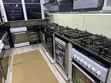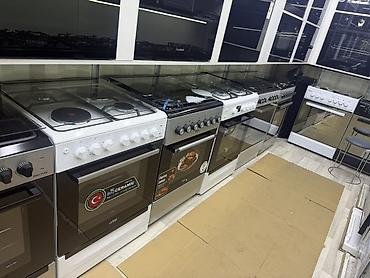 - Напольные плиты 50–60 см: газовые, комбинированные (газ + электрическая конфорка), а также модели с электрической духовкой. 4 конфорки, механические переключатели, стеклянные крышки, эмалированные или чугунные решётки. Духовки с подсветкой, грилем, смотровым стеклом, механическим таймером.