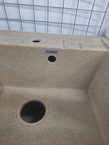 Кухонная раковина GranFest бежевого цвета, выполненная из искусственного камня. Эта прямоугольная мойка имеет одно глубокое отделение и оснащена двумя отверстиями: одно для смесителя, другое, меньшее, вероятно, для дозатора моющего средства. Встроенная сушилка для посуды с рифленой поверхностью обеспечивает удобство использования. Сливная решетка расположена по центру основного отделения, что облегчает отвод воды. Идеально подходит для современной кухни, обеспечивая функциональность и эстетичный вид.