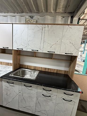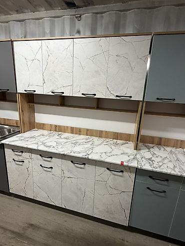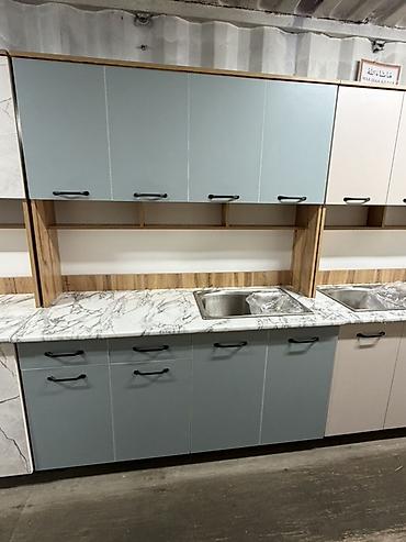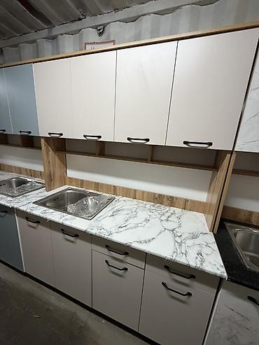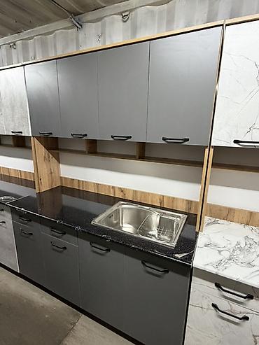 - Комплектация: нижние тумбы с выдвижными ящиками и распашными дверцами, верхние навесные шкафы, открытые ниши; врезная мойка из нержавеющей стали.