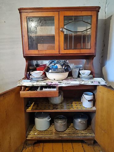 Подойдёт для кухни, дачи, интерьеров в стиле ретро, винтаж или кантри, а также под реставрацию/декор. Размеры визуально стандартные для буфетов советской эпохи: ориентировочно около 160–180 см по высоте, 90–110 см по ширине, 45–55 см по глубине (точные размеры можно снять на месте).