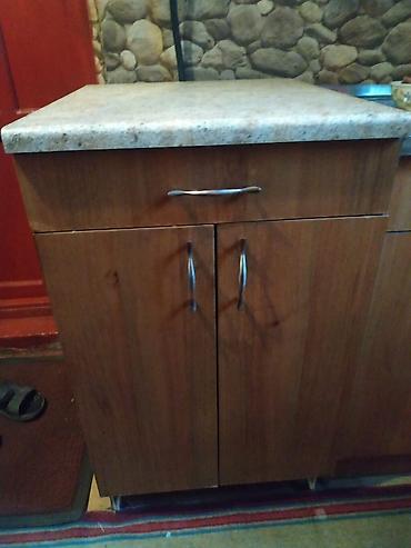 - Напольный шкаф с выдвижным ящиком и распашными дверцами; столешница каменного оттенка.