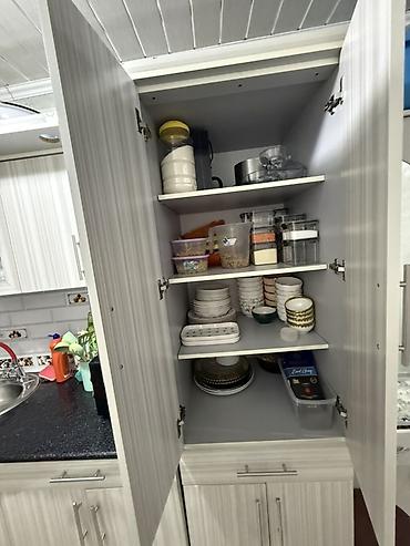 - Высокий шкаф-пенал: двойные распашные двери, внутри несколько регулируемых по высоте полок для хранения посуды и продуктов; нижняя тумба с отдельными дверцами; межсекционный выдвижной ящик.