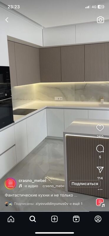 - Возможность исполнения в вариантах: прямой или угловой гарнитур; сочетание гладких и рейлинговых фасадов; интегрированная подсветка рабочей зоны (пример на фото-вдохновении).