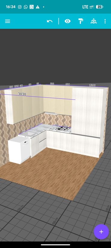 - Визуализация угловой конфигурации доступна: размеры по верхнему ряду примерно 3030 мм с секциями 600/350/600/900/1200 мм; нижний ряд с зонами под посудомоечную машину, варочную поверхность и т.д.