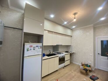 - Фасады без ручек, ровные глянцевые/полуглянцевые светлые панели в спокойной бежево‑кремовой гамме.