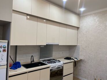Кухонный гарнитур с верхними и нижними модулями, выполненный в современном минималистичном стиле.
