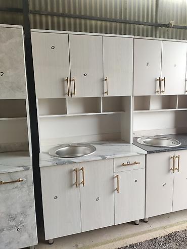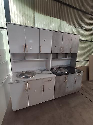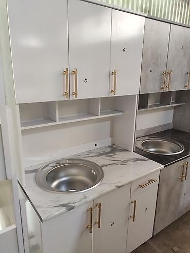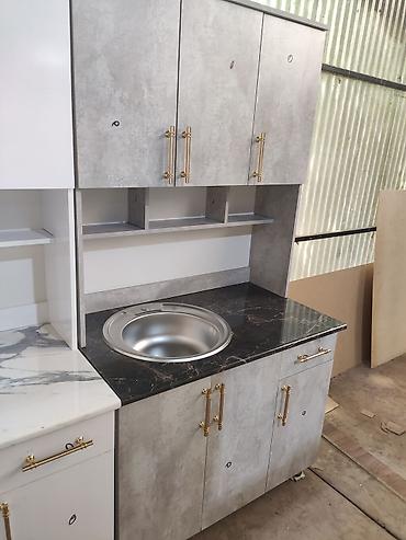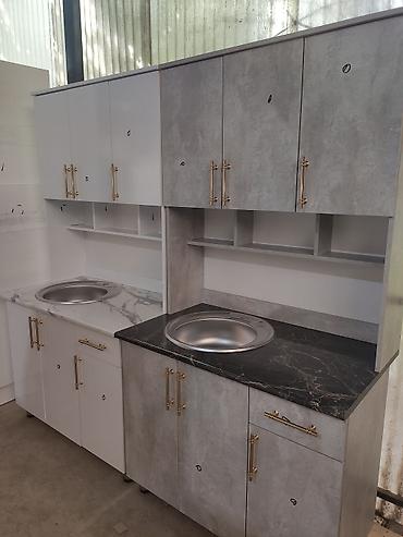 цена без мойка 12000 с мойкой 13500 доставка по городу бишкек 500 Кухонный гарнитур с серыми фасадами, имитирующими бетонную поверхность, и столешницей с рисунком под белый мрамор. Верхние шкафы с ...