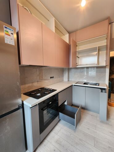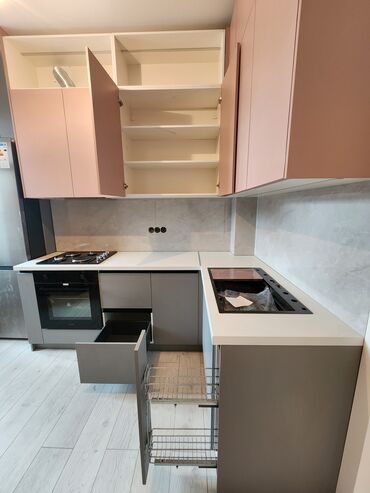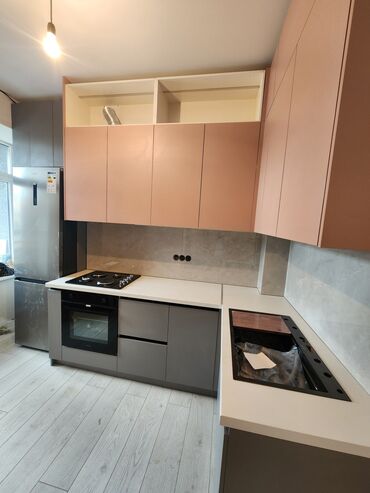 - Фасады: гладкие, без ручек (push-to-open), сочетание пудрово-розового верха и графитового низа.