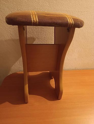 - Два табурета в одном стиле: основание из древесных плит светлого тона, фигурные ножки с соединительной планкой. Мягкое сиденье квадратной формы с тканевой обивкой в коричнево‑бежевую клетку с золотистыми акцентами.