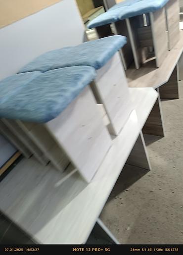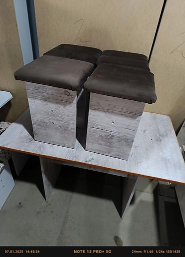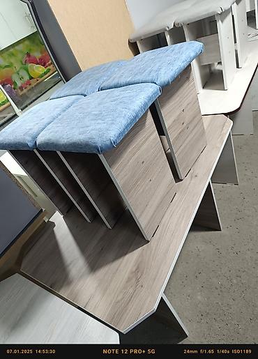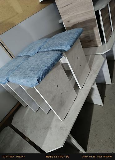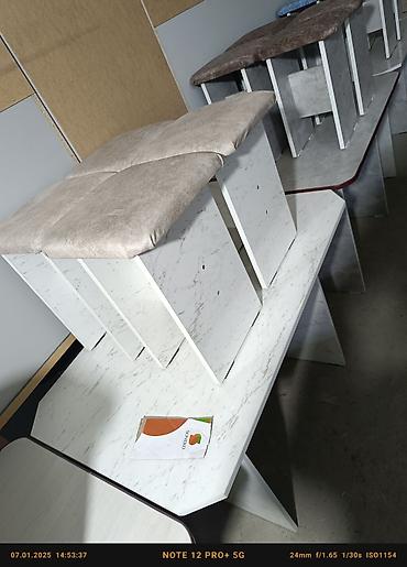 Комплект обеденного стола с табуретами - Состав: прямоугольный обеденный стол и 4 табурета. - Дизайн: современный минимализм с имитацией камня/дерева; закругленные углы столешницы. - Столешница: г...