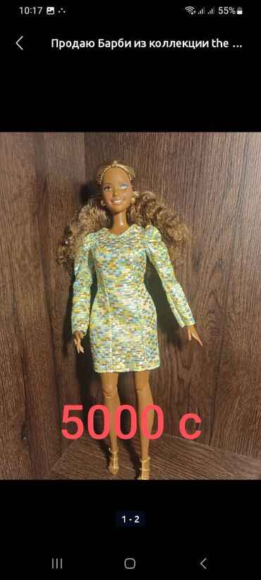 - Барби из коллекции The Barbie Look (указано на скриншоте): блестящее платье мозаичного узора в золотисто‑голубых тонах, золотые туфли и украшения. Цена на фото: 5000 с.