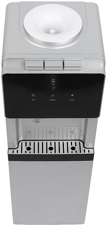 Кулер для питьевой воды, напольный, с верхней загрузкой бутыли. Современный серебристо‑черный дизайн с сенсорной панелью индикации (Hot/Power/Cold) и тремя раздельными кранами для: