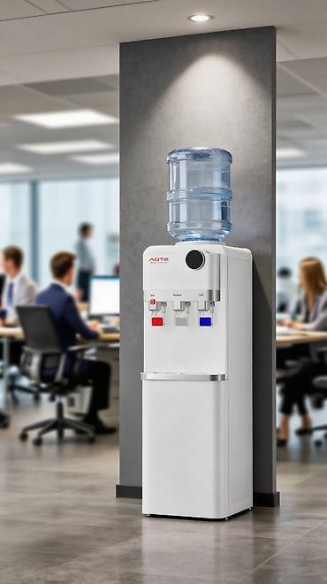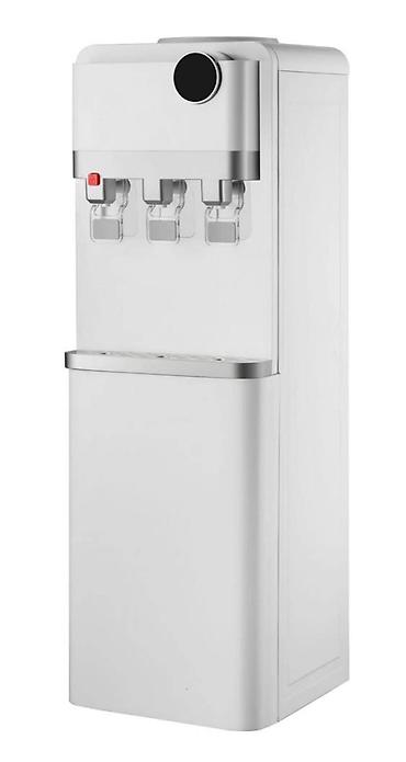 Кулер для воды напольный с тремя кранами: горячая, комнатная и холодная вода.