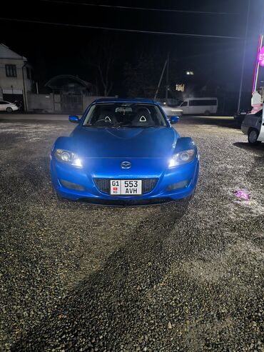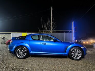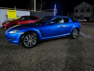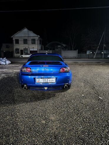 Mazda RX-8, купе с уникальной роторной концепцией и классической компоновкой RWD. Яркий синий цвет, спортивный аэродизайн со спойлером, двухствольная выхлопная система и задние двери для удобной посадки на второй ряд.
