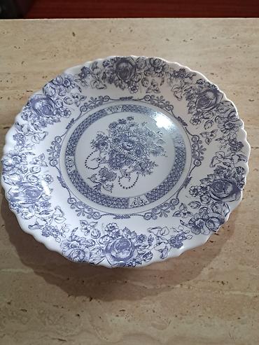 Круглое фарфоровое блюдо. Основная часть тарелки выполнена в светлых тонах, а по краю имеется широкая синяя кайма с узором в виде кудрявых белых облаков. Идеально подходит для сервировки стола на к...