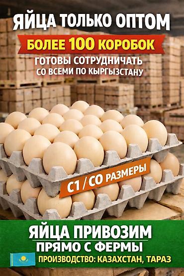 Куриные яйца для оптовых покупателей. - Размеры: C1 -6 сом . - C0- 8 сом - Формат продаж: только оптом - Минимальная партия: от 100 коробок и выше - Упаковка: лотки на поддонах - Доставка: по вс...