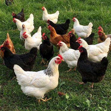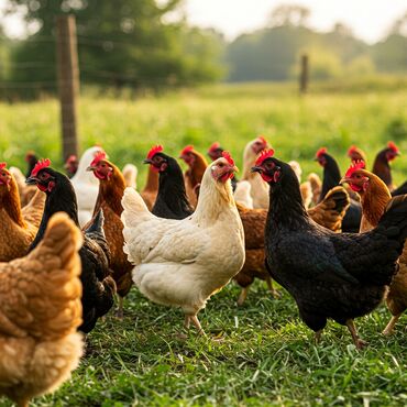 - Породы: белые, рыжие/бурые, черные и пестрые кроссы и традиционные несушки (на фото — разнообразное стадо).