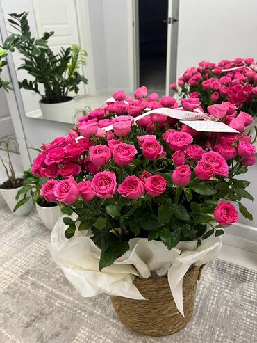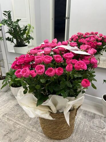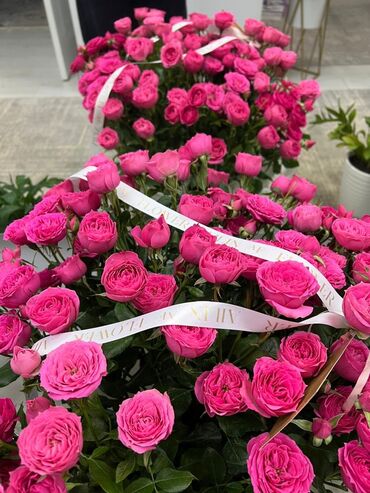 - Пышная композиция из ярко‑малиновых кустовых роз с десятками бутонов на каждом кусте.