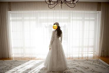 - Декор: сложная ручная вышивка, объемные аппликации из жемчужных бусин и кристаллов, декоративные элементы по линии лифа и манжет