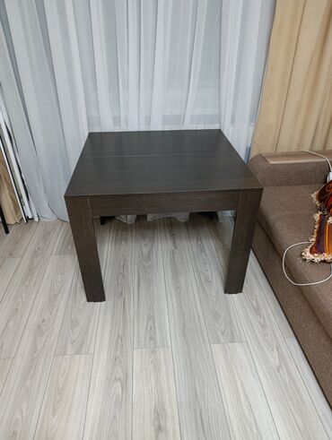 Квадратный обеденный стол темно-коричневого цвета с четырьмя устойчивыми ножками. Столешница имеет складную конструкцию, что позволяет увеличить ее площадь при необходимости на 4 метра. Прямоугольные ножки обеспечивают надежную поддержку. Стол подойдет для использования на кухне или в столовой, а также в качестве дополнительной поверхности для работы или отдыха. Его компактные размеры делают его подходящим для небольших помещений. В отличном состоянии