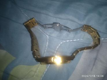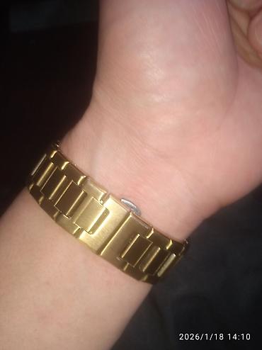 - Металлический браслет золотистого цвета с раскладывающейся застежкой-бабочкой.