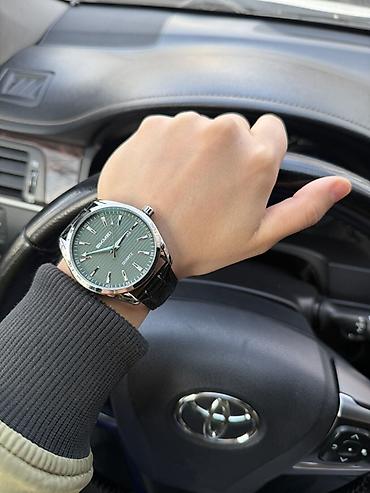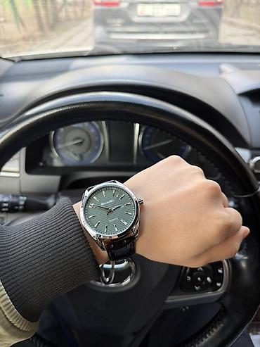 - Зеленый циферблат с горизонтальной текстурой; тонкие накладные метки и стрелки с контрастным покрытием для хорошей читаемости.