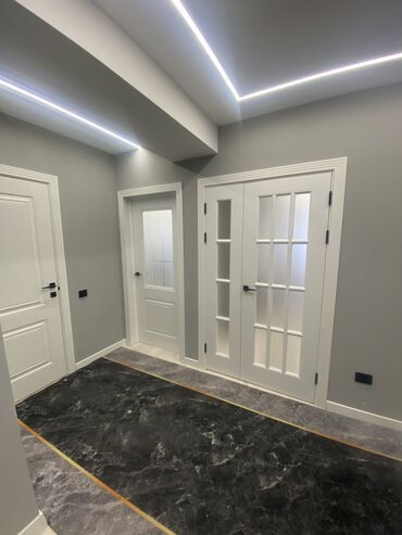 - Современный ремонт в светлых тонах, потолочные LED-линии по всей квартире, аккуратные белые двери с матовыми вставками.