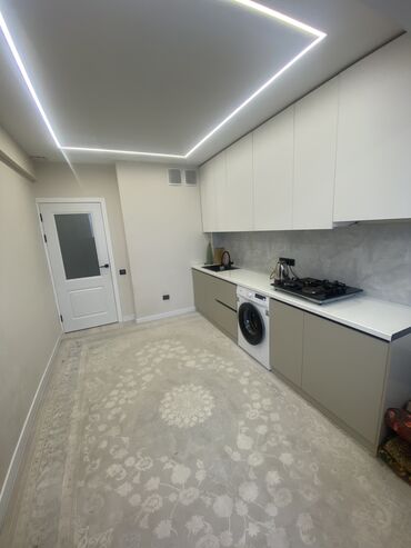 - Кухня отдельная, линейный гарнитур до потолка с большим количеством хранения, газовая варочная панель, мойка, рабочая поверхность, стиральная машина, электрочайник.