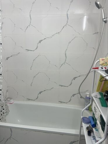 - Ванная комната: облицовка крупноформатной плиткой под мрамор, ванна с душевой лейкой, раковина на пьедестале, зеркальный шкафчик/полка, карниз со шторой, напольные коврики, открытые полки для хранения. Стиральная машина установлена в санузле.