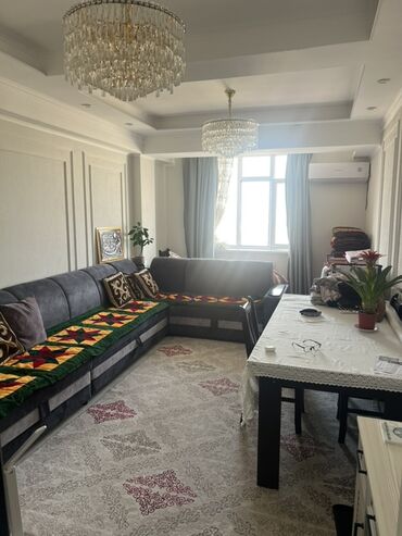 - Гостиная: большая комната с оконным проёмом, натяжными потолками со сложными уровнями, встроенными точечными светильниками и двумя хрустальными люстрами. Установлен кондиционер. Уютный угловой диван, обеденный стол у окна, декоративные молдинги на стенах.