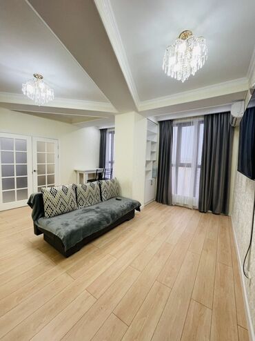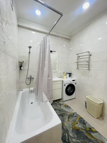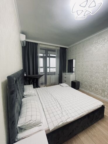 Представляем квартиру с современным дизайном, сочетающим функциональность и уют. Просторная кухня-гостиная оборудована угловой кухонной мебелью с матовыми фасадами и черной столешницей, а также обеденной зоной со столом и стульями. В спальне расположена большая кровать с мягким изголовьем и прикроватные тумбы. Ванная комната оснащена ванной, раковиной с тумбой и стиральной машиной. В квартире предусмотрены кондиционеры для комфортного микроклимата. Окна выходят на городской пейзаж, обеспечивая достаточное естественное освещение и вид на город.