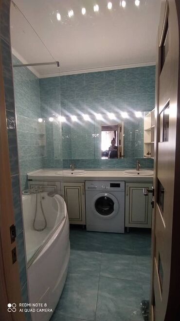 - Санузел: просторная ванная комната в бирюзовой плитке, угловая ванна, двойная раковина с тумбами для хранения, большое зеркало с подсветкой, стиральная машина.