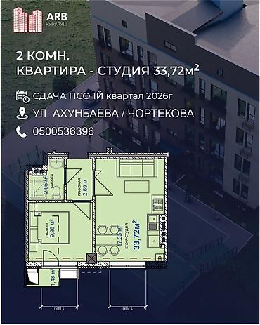 - 33,72 м²: кухня‑студия, спальня 9,20 м², санузел, прихожая.