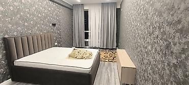 - Изолированная спальня с двуспальной кроватью, высоким мягким изголовьем, матрасом, прикроватным освещением и комодом; панорамное окно, двухслойные шторы.
