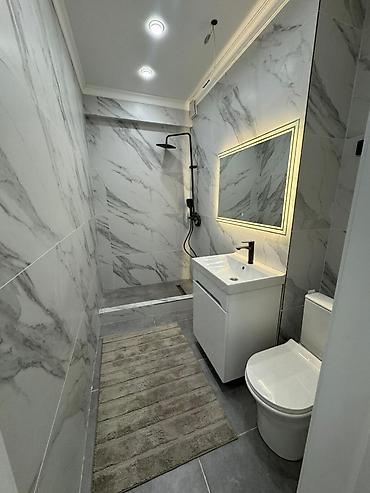 - Санузел с душевой зоной «walk-in», черной сантехникой, подвесным зеркалом с подсветкой и керамогранитом под мрамор.