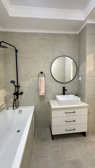 - Ванная комната: ванна стандартной длины, смесители и душевая система в матовом чёрном исполнении, тумба с умывальником-чашей, круглое зеркало, полотенцедержатель.