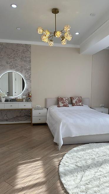 - Спальня: двуспальная кровать с текстильным изголовьем, прикроватные тумбы, туалетный столик с круглым зеркалом и LED‑подсветкой.