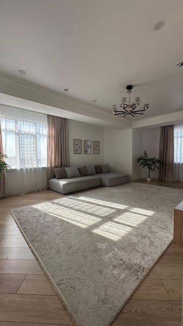- Гостиная: модульный угловой диван, большой фактурный ковер, настенные арт‑панно, шторы блэкаут и тюль.